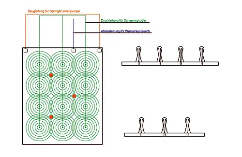 Für die dargestellten Modelle existieren sehr viele Variationen bezüglich Sprühbilder und Leistungsdaten. Wir installieren die komplette Technik wie Pumpen, Rohrleitung, Düsen und Fontänen, Steuerungs- und Beleuchtungstechnik.