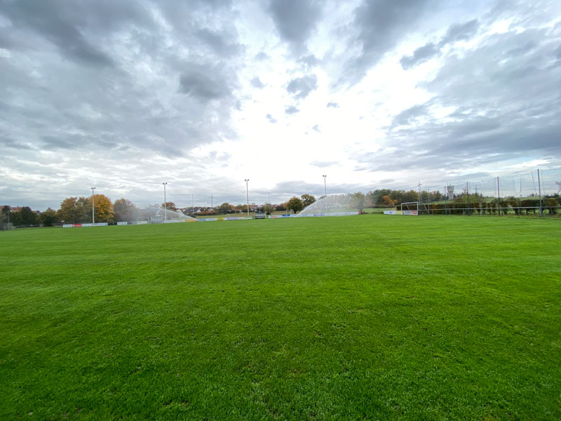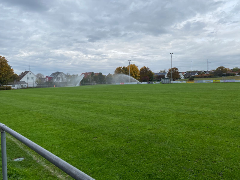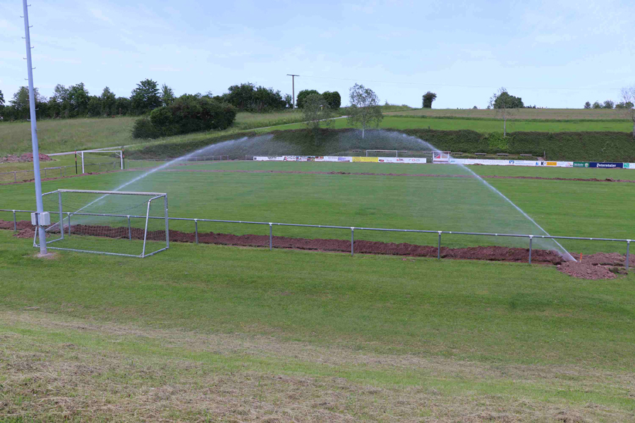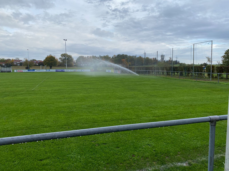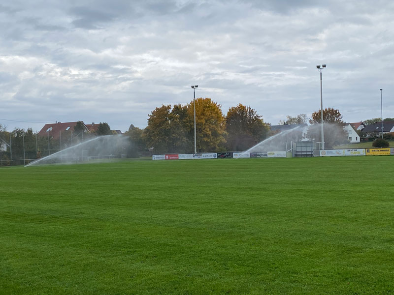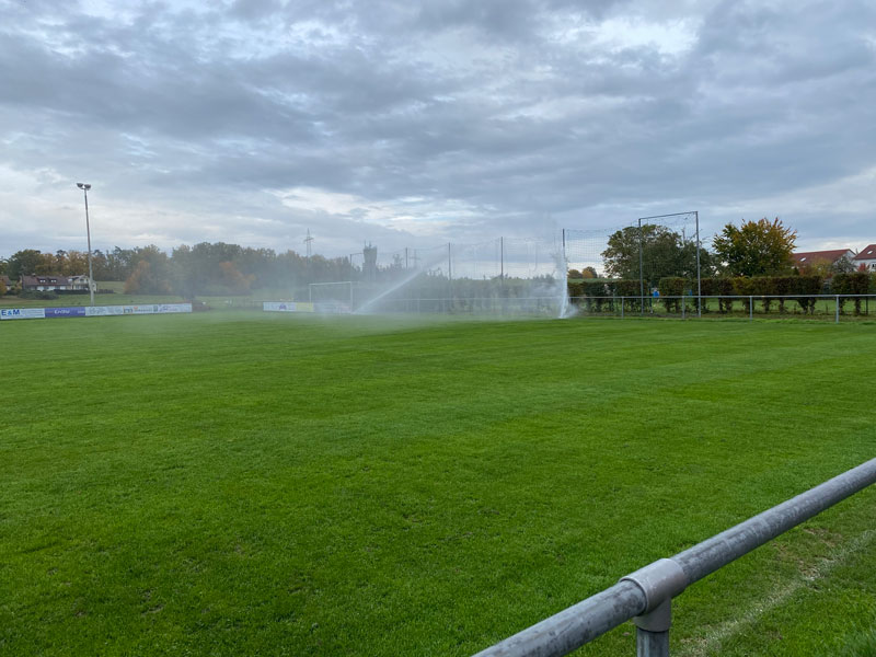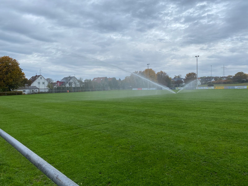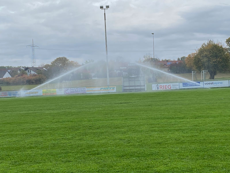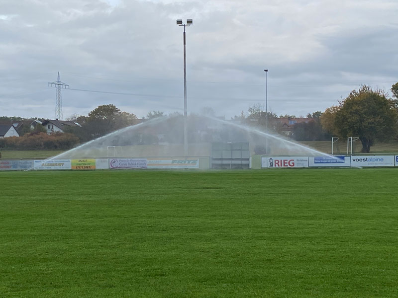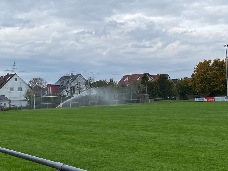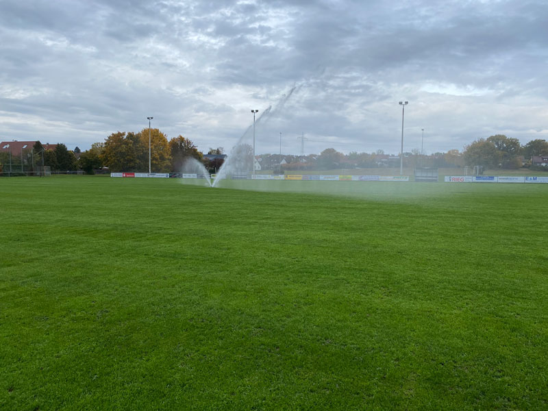 Neubau einer PERROT-Beregnungsanlage auf Kunstrasenplatz / Hockey mit 8 Randregnern und 38 m³ Tiefbrunnenpumpstation